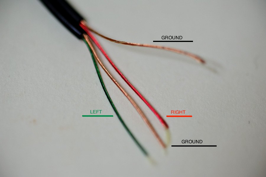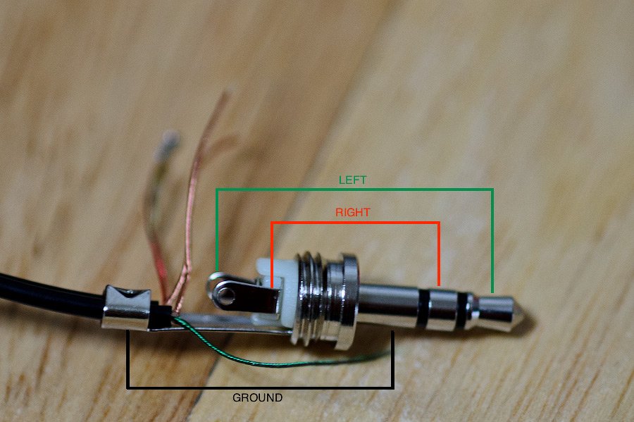 Если брали провод и штекер отдельно — на свободном конце собирают обычный 3.5 джек. Красный правый, зелёный левый, а оставшиеся подсоединить к корпусу штекера.