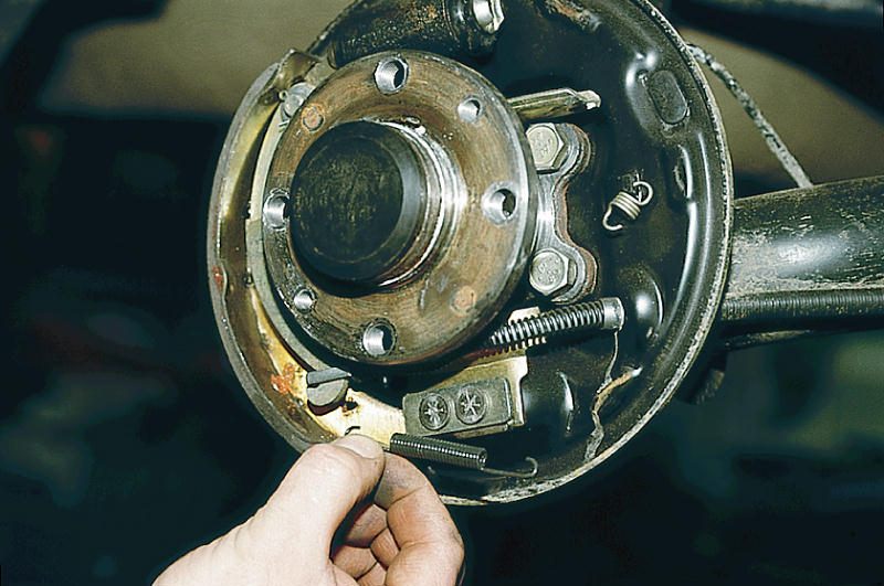 - При помощи плоскогубцев следует отсоединить пружину, стягивающую тормозные колодки в нижней части.