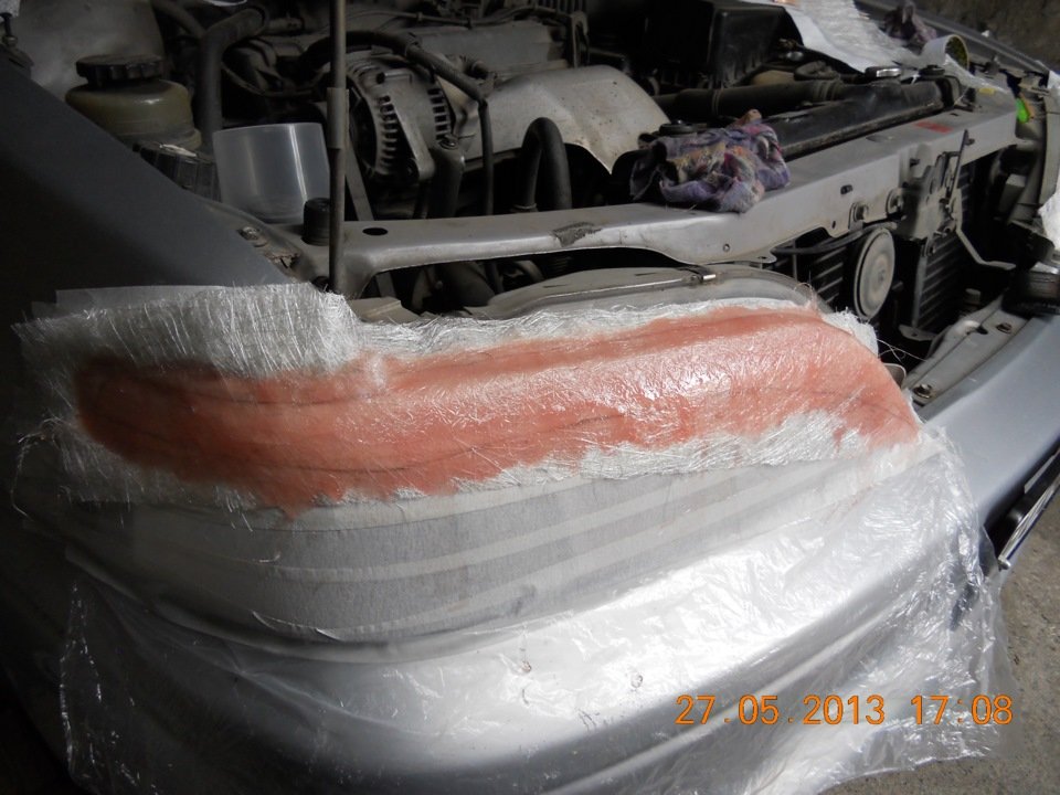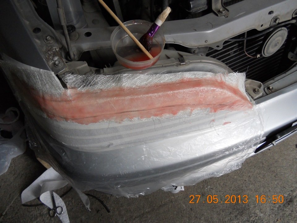 - На подсохший слой наносим новый слой смолы и стекловолокна по той же схеме