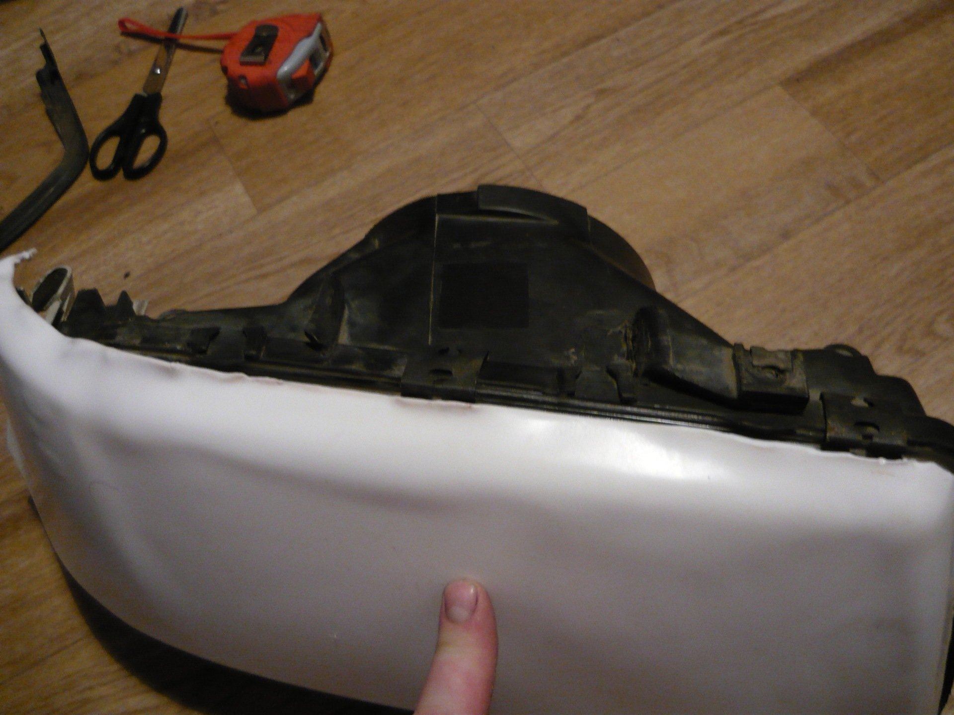- К снятой фаре приложите отрезанный лист, и, нагревая феном, разглаживайте до тех пор, пока лист не станет полностью повторять форму фары.