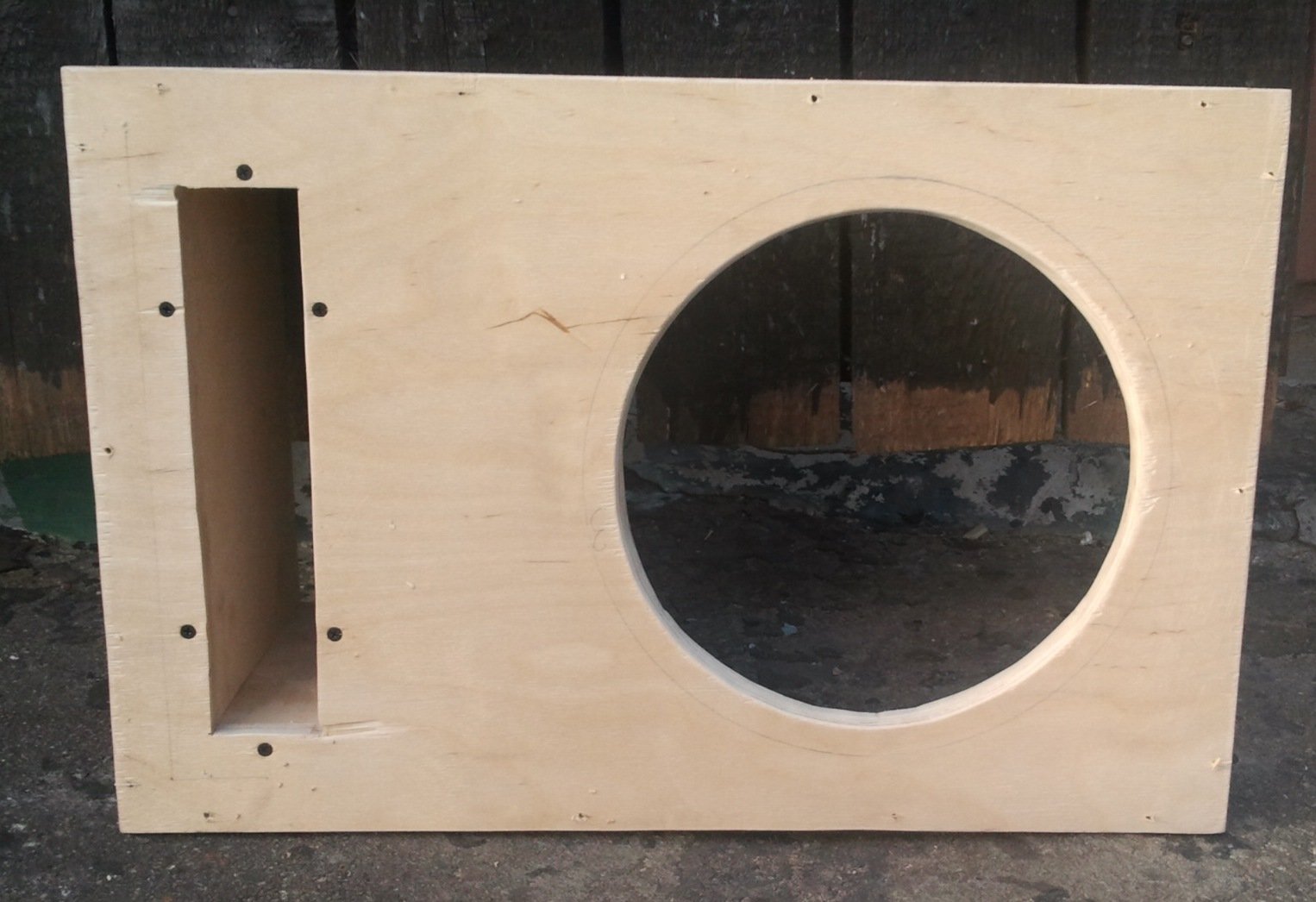 - Под размер динамика (например, диаметр 160 мм) вырезать отверстие в передней части корпусной заготовки.