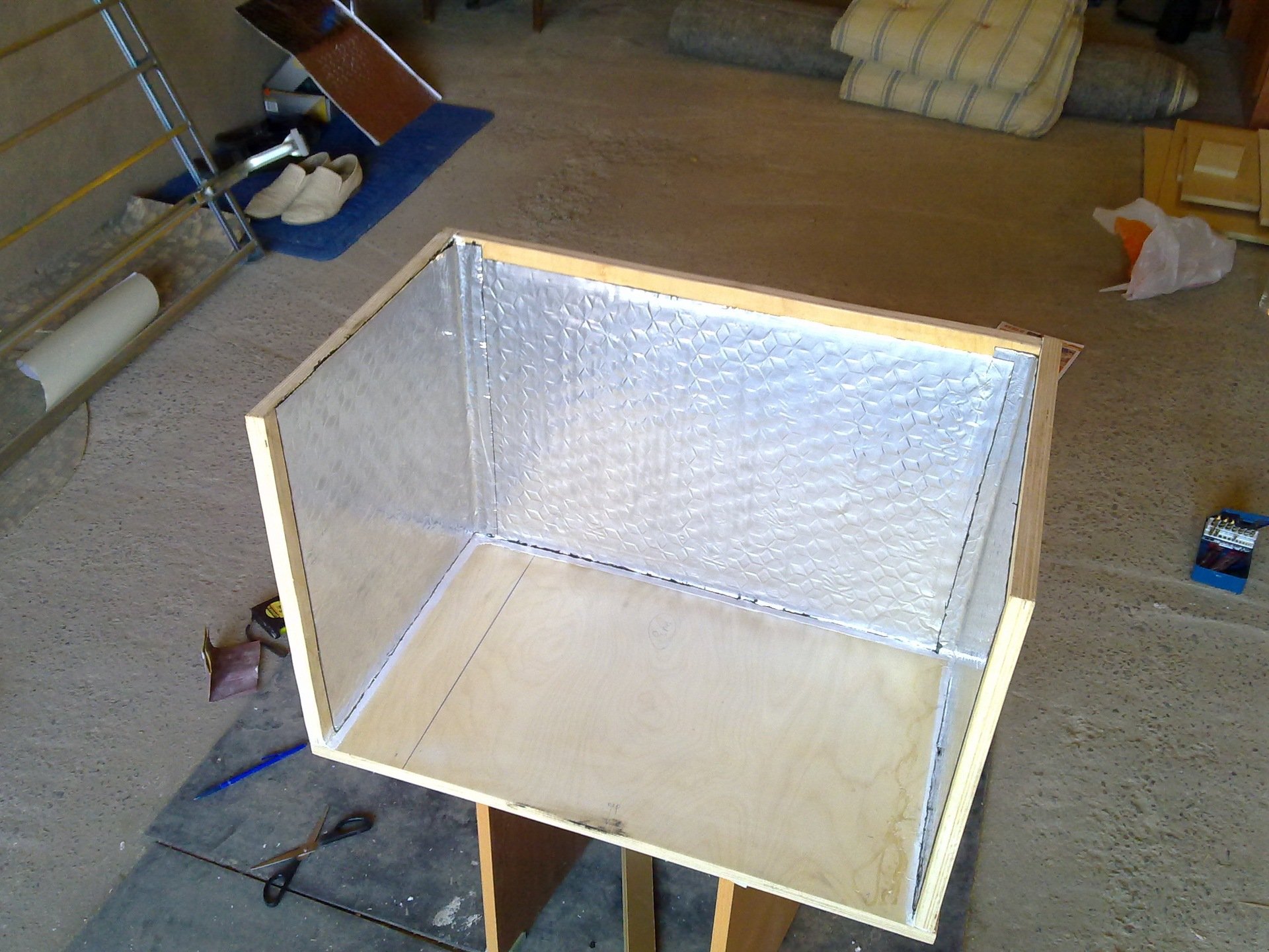 - Дальше необходимо провести внутреннюю отделку корпуса: для этого смолой или герметиком нужно промазать все стыки и щели для повышения герметизации, после чего на все боковые панели приклеивается шумоизоляционная ткань.
