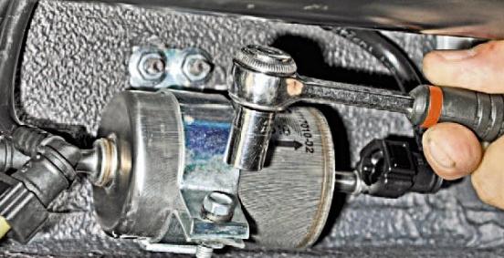 - Расслабляем хомутик, удерживающий фильтр на своём месте (развинчивать соединение полностью не надо, достаточно расслабить).